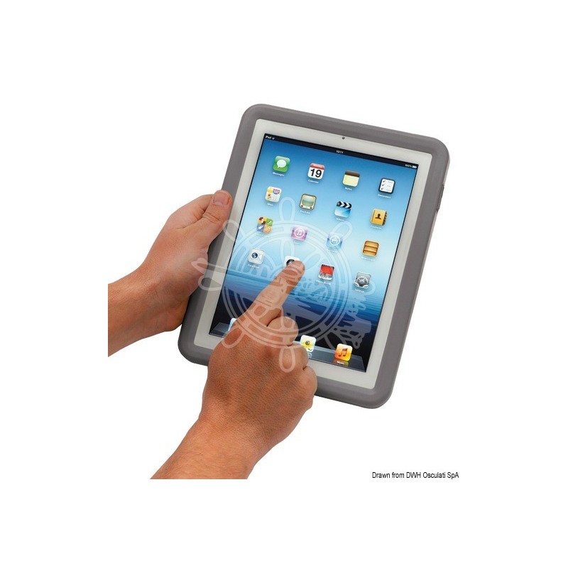 Protection en matériau souple semi-rigide qui rend votre "iPad" anti-dérapant, antichoc, imperméable et flottant. Dotée de poignée de prise arrière en cuir, qui peut être empoignée par une main ou par l'autre.