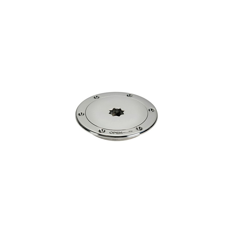 En acier inox AISI316. Ouverture 1/4 de tour avec poignée winch, à commander séparément. Le bouchon reste attaché à la poignée pour faciliter le soulèvement.